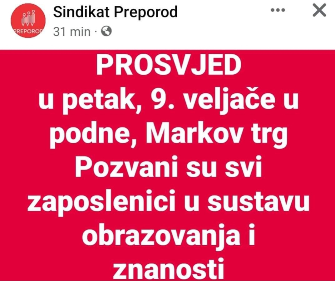 Pozivamo članove i dajemo podršku reprezentativnim obrazovnim sindikatima Sindikatu Preporod i Nezavisnom sindikatu znanosti i visokog obrazovanja u opravdanoj borbi za materijalna prava radnika, prvenstveno za korekciju uredbe o koeficijentima profesora i učitelja.